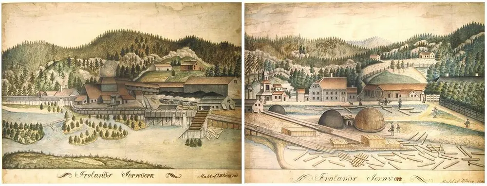 Jernverket i Froland etter to akvareller malt av Lars Berg i 1831. I det venstre bildet ser vi smeltehytta med masovnen. Taket på hovedgården stikker så vidt opp av skogen i det høyre bildet, og i forgrunnen ser vi kullmiler. Foto: Aust-Agder arkiv og museum (AAM.B.0147 og AAM.B.0146).