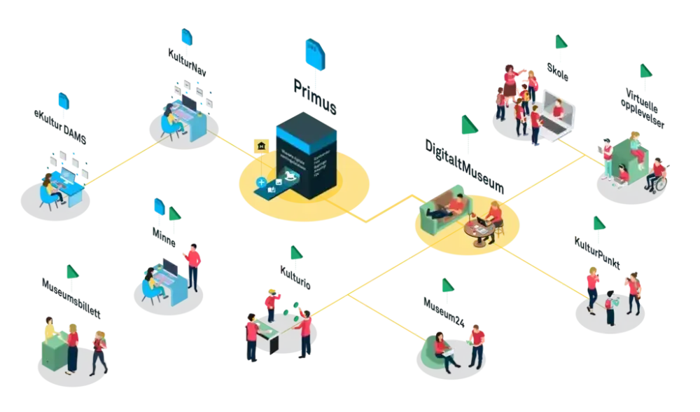 Løsningene henger sammen i et digitalt økosystem med en felles infrastruktur. Derfor kan du publisere samlinger og objekter rett fra Primus til DigitaltMuseum, og formidle innholdet via formidlingsløsninger som Kulturio og KulturPunkt eller på nettsidene til museet.